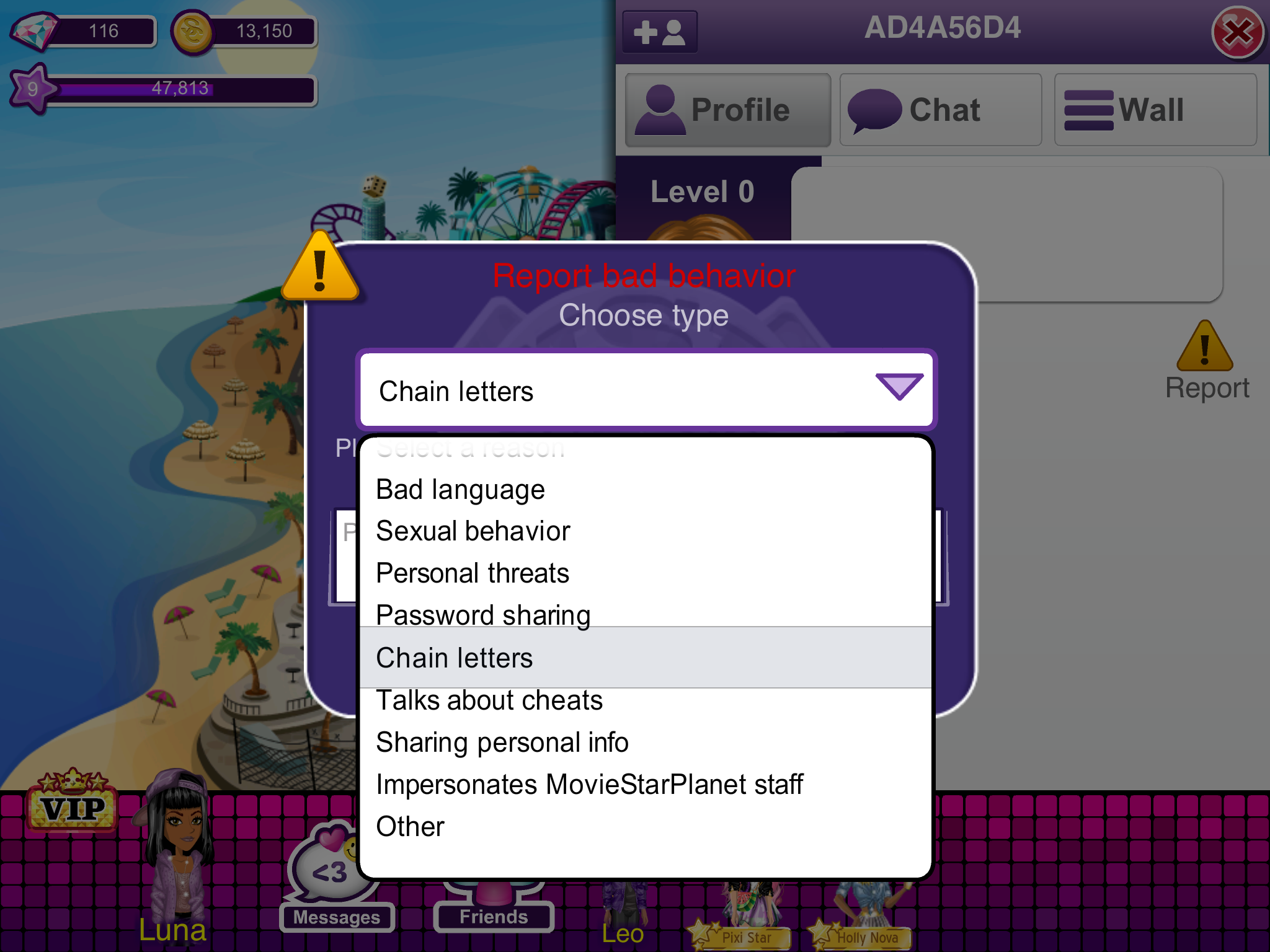 Bitte denke daran nur die Nutzer zu melden, die auch wirklich die Regeln von MovieStarPlanet gebrochen haben. Melde Nutzer nicht, wenn sie dir einen versprochenen Gegenstand oder ein Like nicht gegeben haben.