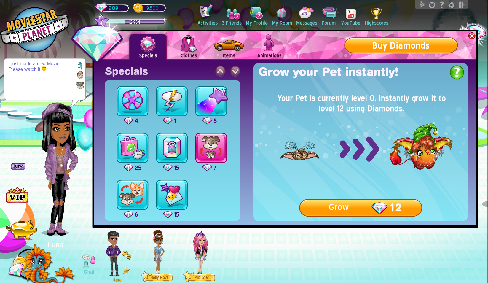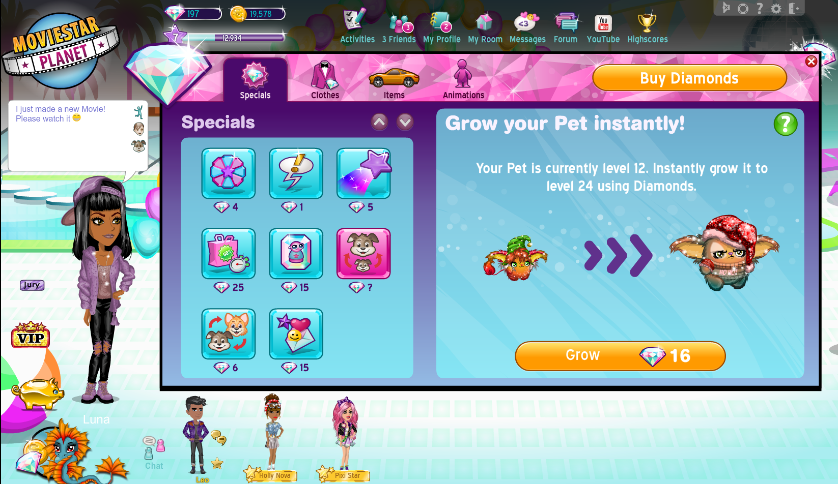 Normalerweise musst du dich regelmässig um dein Tier kümmern, damit es wächst. Aber du kannst es auch, mit diesem Feature auf Anhieb wachsen lassen. Du findest es im Diamond-Shop im Shopping-Bereich. Der Preis passt sich automatisch dem jetzigen Level deines Tieres an.