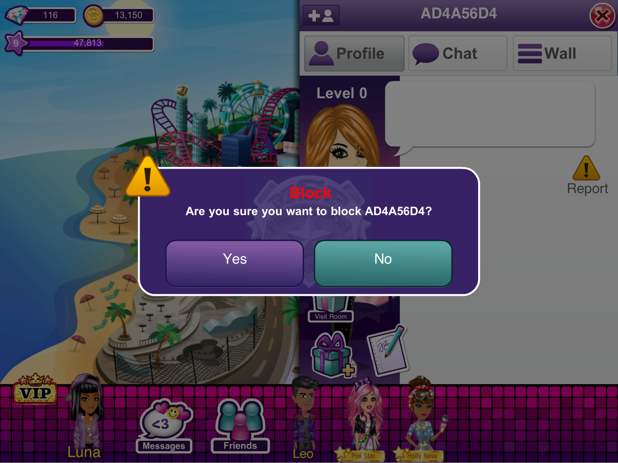 Cuando juegas en la aplicación de MyStarPlanet, también puedes bloquear y desbloquear usuarios. Tendrás que abrir su perfil y hacer click en el triángulo amarillo (Denuncia). Después podrás elegir la opción de bloquear a ese usuario.