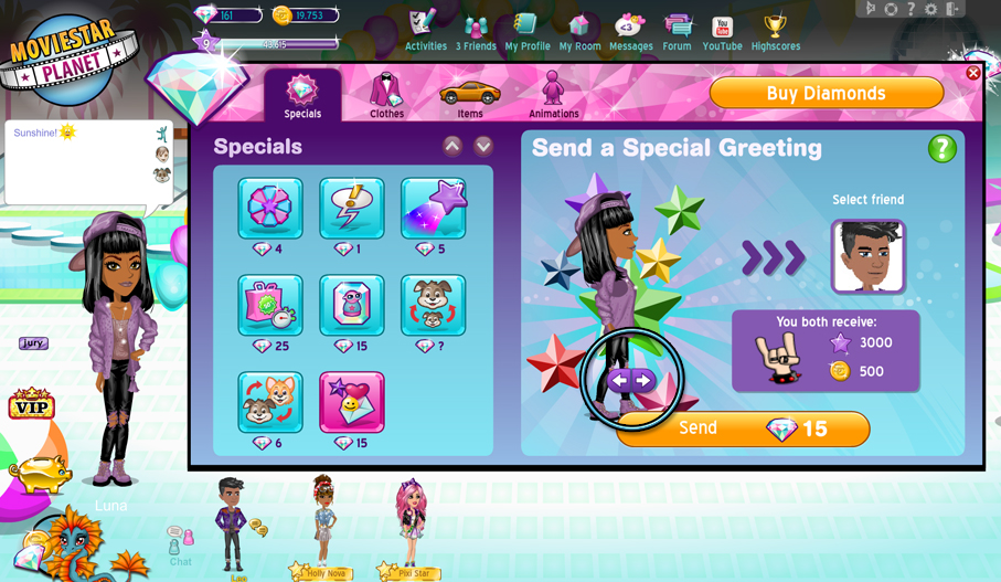 Puedes enviar un saludo especial a cualquiera de tus amigos que estén actualmente en línea. Todo lo que necesita hacer es seleccionar el amigo de su elección y haga clic en "Enviar". Cuesta 15 Diamantes y te trae 3000 Fama y 500 StarCoins.