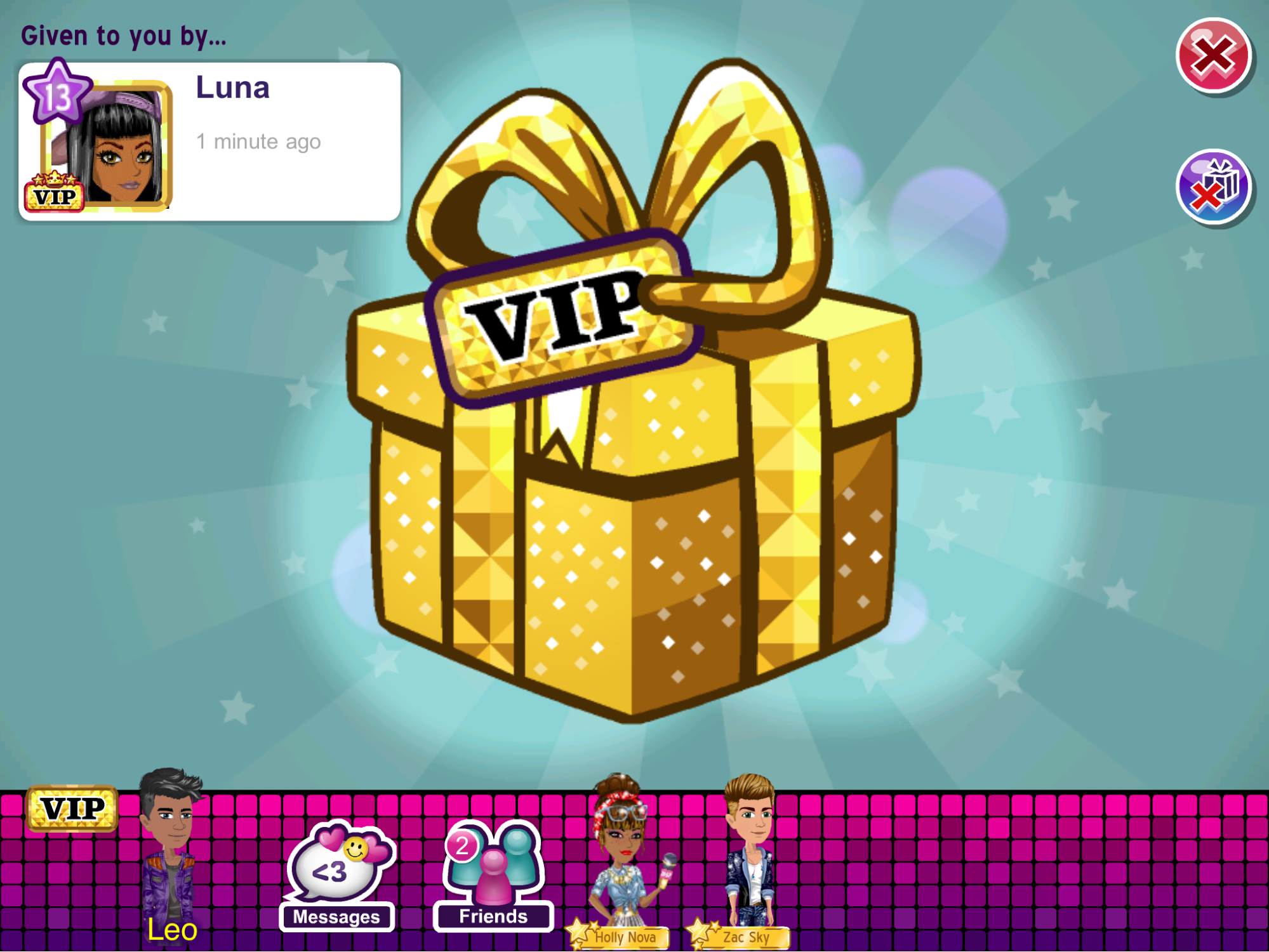 Si estás jugando en la aplicación MovieStarPlanet y has comprado el paquete Diamond StarCoins, elige al amigo o' amiga al que quieres dar VIP a:
