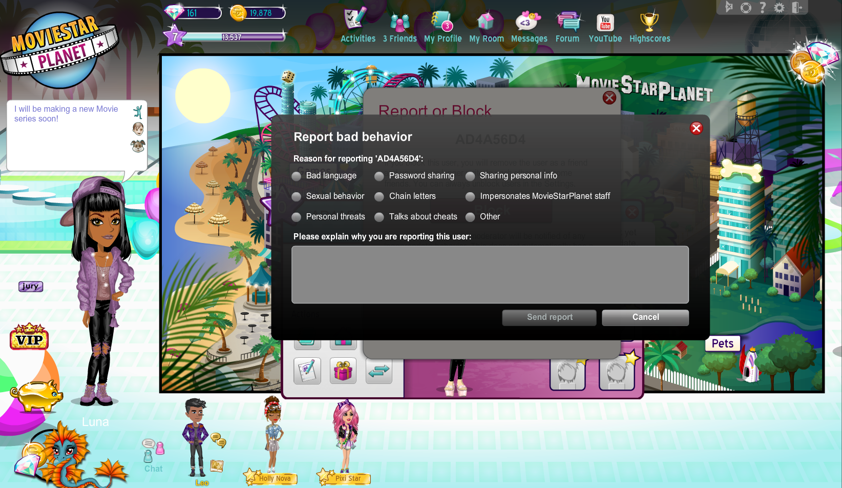 MovieStarPlanetissa on helppoa tehdä ilmoitus toisesta käyttäjästä: Se vaatii vain pari klikkausta. Kannustamme kaikkia tekemään ilmoituksen asiattomasta käytöksestä.