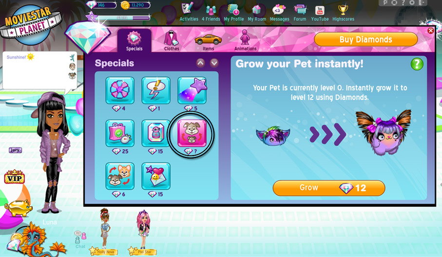 Yleensä sinun pitää säännöllisesti huolehtia lemmikistäsi, jotta se kasvaisi. Mutta, nyt voit kasvattaa tämän toiminnon avulla lemmikkiäsi välittömästi. Löydät sen Timanttikaupasta, Shoppailualueelta. Hinta määräytyy automaattisesti lemmikkisi tämän hetkisen tason mukaan.